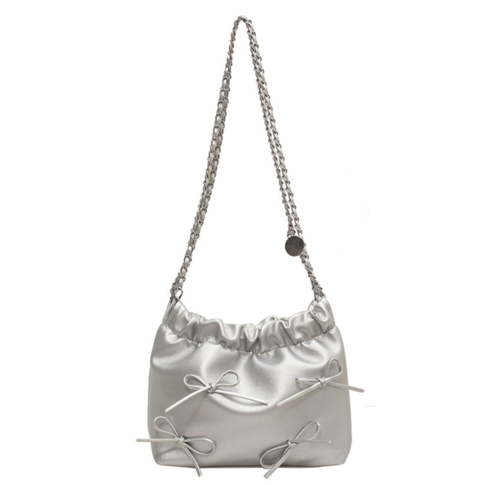 Embrace the regal beauty of the Hera Ribbon Chain Bag. This exquisite bag features delicate ribbon accents and a chic chain design, perfect for adding a touch of romantic elegance to your ensemble. Let your style reign supreme with the charm of Hera.
