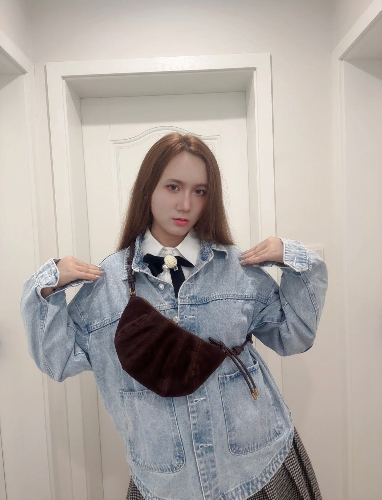 This bag is made of PU suede leather.