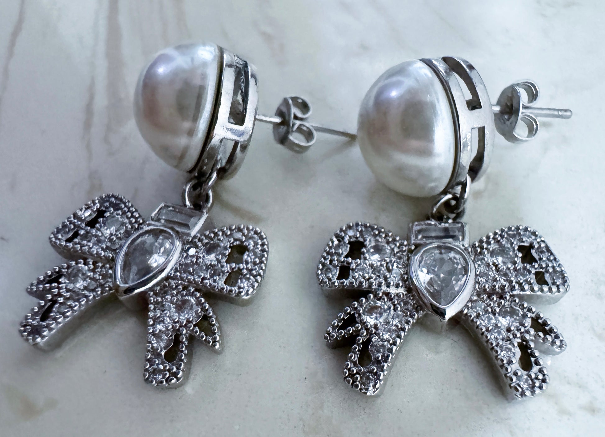Capture the essence of twilight with the Twilight Bow & Pearl Earrings. These stunning earrings feature delicate bow accents and lustrous pearls, perfect for adding a touch of romantic elegance to any ensemble. Embrace your inner beauty and let your style shine.